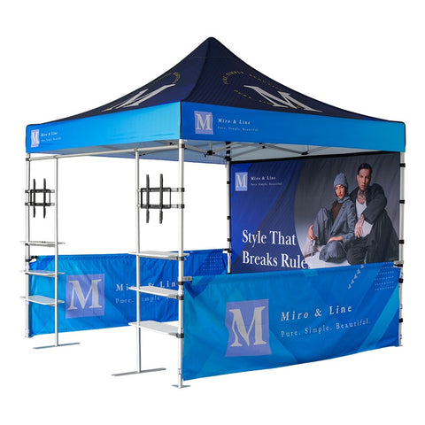 This premium canopy tent bundle is designed to transform any standard 10x10ft space into a high-tech, multifunctional marketing hub. The A1 kit features a 10x10ft canopy tent, one full back wall, and two half walls with support poles, seamlessly integrated with two tent display shelf & TV rack. This sophisticated configuration empowers your brand to engage audiences through synchronized digital content while providing organized, professional shelf space for physical product samples.